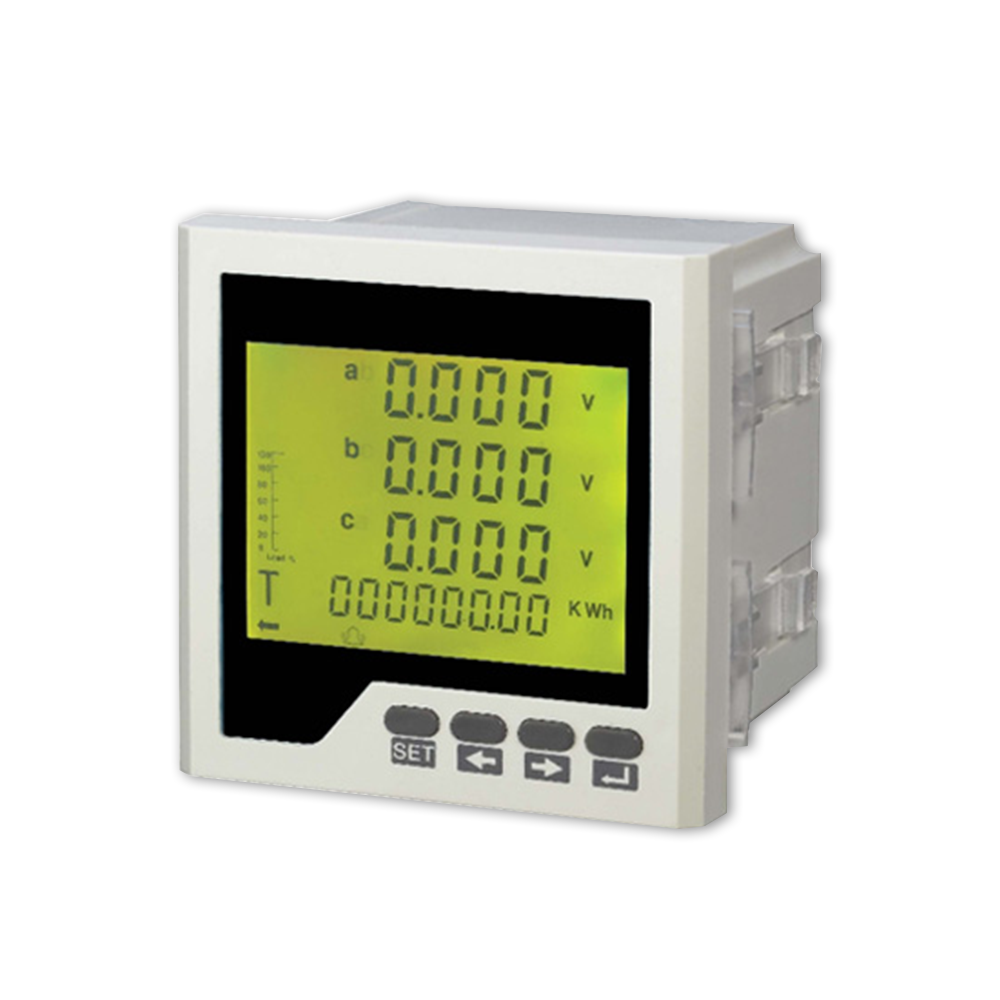 三相多功能電量儀 用于檢測機房供電的三相電參數(shù)(比如各相電壓、電流、功率、頻率等參數(shù)),每個儀表的大小為96*96*96mm, 一般放置在電箱里。一般將機房供電的三相三線或者三相四線連接到儀表的前面接頭,儀表輸出信號為RS485數(shù)據(jù)通訊(二芯,雙絞線連接至RS485總線上)。