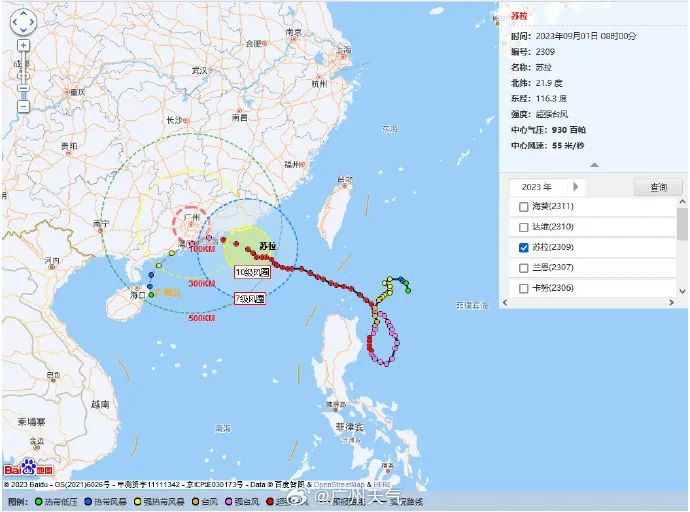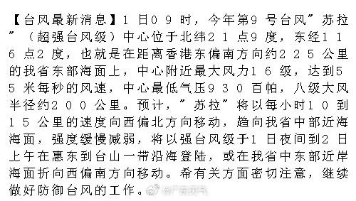 截至1日09時,“蘇拉”(超強臺風(fēng)級)中心位于距離廣州市東南方向約315公里的南海東北部海面上,也就是北緯21.9度、東經(jīng)116.2度,中心附近最大風(fēng)力16級(55米/秒),中心最低氣壓930百帕。