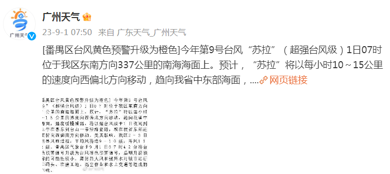 另外據(jù)市氣象臺監(jiān)測,廣州市達(dá)到啟動氣象災(zāi)害(臺風(fēng))Ⅲ級應(yīng)急響應(yīng)標(biāo)準(zhǔn)。市氣象災(zāi)害應(yīng)急指揮部決定從9月1日2時56分起將廣州市氣象災(zāi)害(臺風(fēng))Ⅳ級應(yīng)急響應(yīng)升級為Ⅲ級應(yīng)急響應(yīng)。請按照預(yù)案規(guī)定做好防御工作。