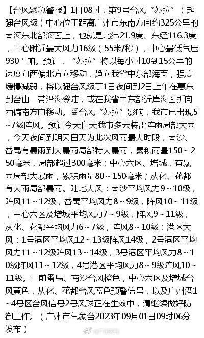 目前番禺、南沙臺風(fēng)橙色,中心六區(qū)及增城臺風(fēng)黃色,從化、花都臺風(fēng)藍(lán)色預(yù)警信號,以及廣州港1~4號區(qū)臺風(fēng)信號2號風(fēng)球正在生效中,請繼續(xù)做好防御工作。