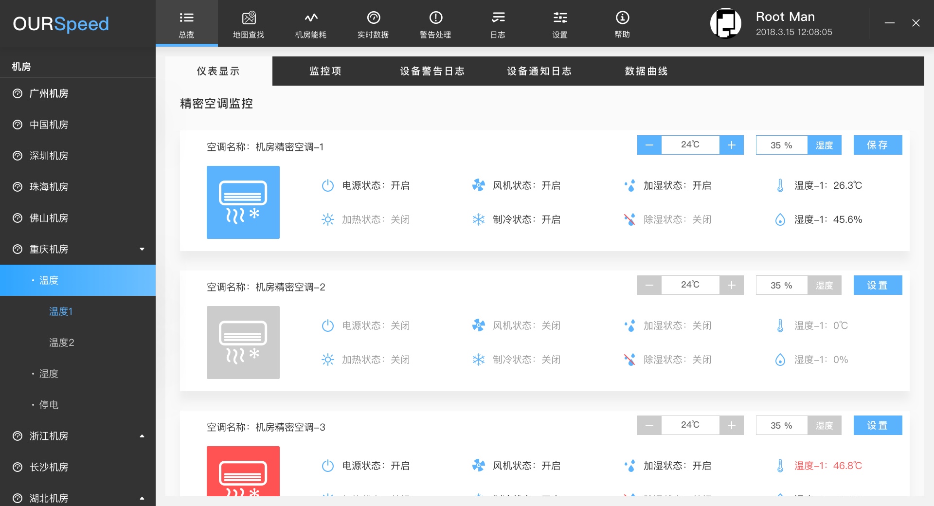 動力環(huán)境監(jiān)控系統(tǒng)聯(lián)動空調(diào)、除濕機、風(fēng)機等來調(diào)節(jié)機房溫濕度,機房的主要熱量來自于設(shè)備的散熱、太陽輻射熱、照明等,其中設(shè)備運行產(chǎn)生的熱量是機房中的主要熱源,溫度過高過低都不利于設(shè)備的運行,因此一個智能化的環(huán)控系統(tǒng)就顯得非常重要。