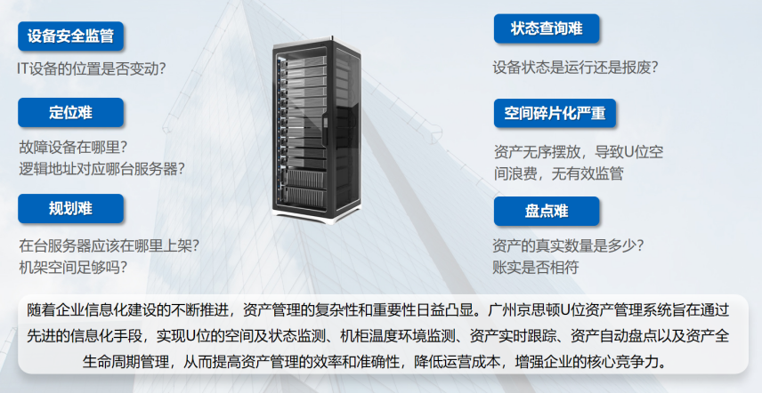 廣州斯必得U位資產(chǎn)管理系統(tǒng)通過先進(jìn)的技術(shù)手段和管理理念,實(shí)現(xiàn)了對U位空間和狀態(tài)、機(jī)柜溫度環(huán)境、資產(chǎn)實(shí)時(shí)跟蹤、自動盤點(diǎn)以及全生命周期的全面管理。該系統(tǒng)的實(shí)施將有效提升企業(yè)的資產(chǎn)管理水平,降低運(yùn)營成本,增強(qiáng)企業(yè)的競爭力。