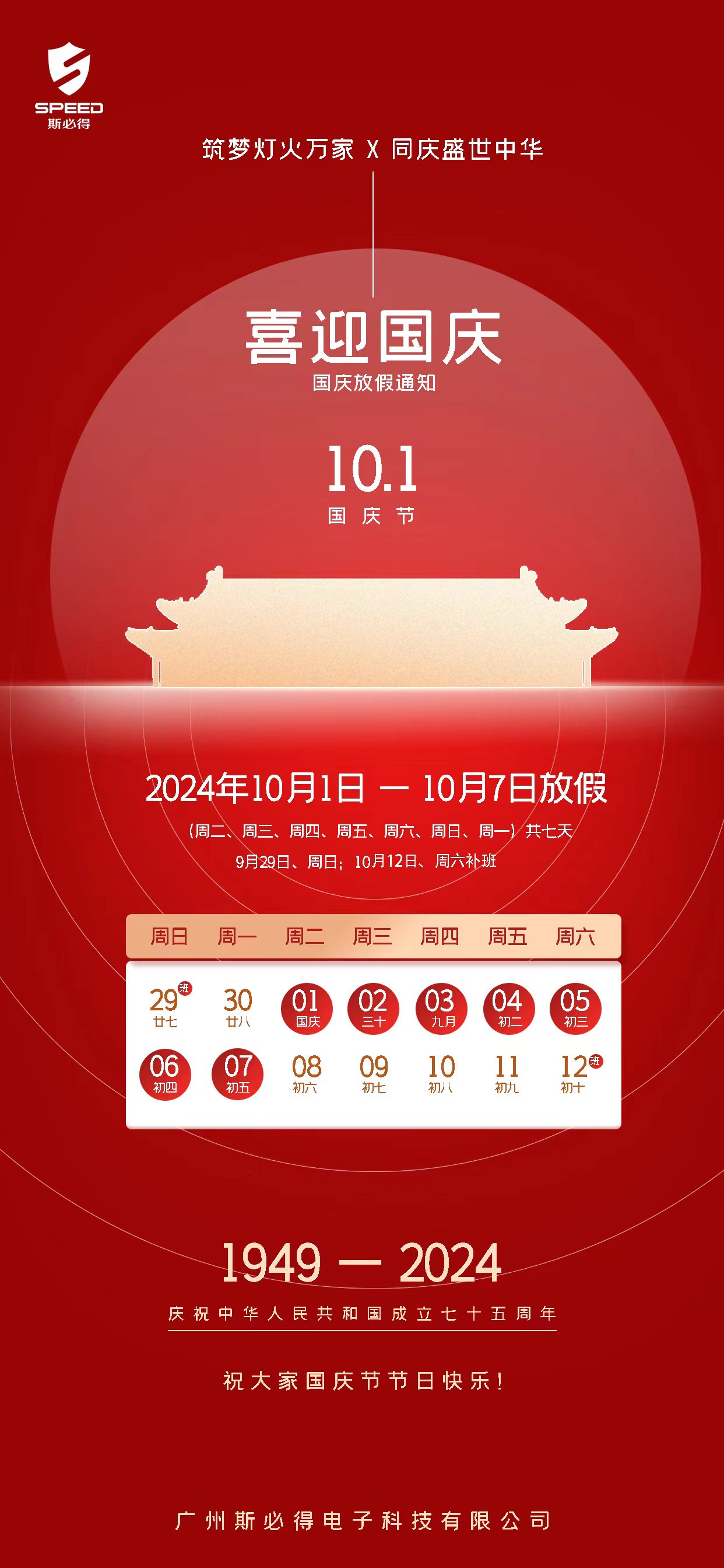 值此舉國同慶、盛世歡歌之際,我們謹向您致以最誠摯的節(jié)日問候!廣州斯必得響應(yīng)《關(guān)于2024年部分節(jié)假日安排的通知》,國慶節(jié)放假時間為2024年10月1日-10月7日,為確保國慶假期期間各項業(yè)務(wù)的有序進行,特此就發(fā)貨、施工安裝及調(diào)試等相關(guān)安排作出以下說明及安排,為您帶來更加貼心與高效的服務(wù)體驗。